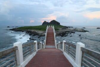 Puis direction la côte Nord-Ouest, pour rejoindre Danshui. Danshui s’appelait autrefois Huwei. C’est une dérivation de l’ancienne langue Hoba. Cela signifie la sortie de la rivière. La ville est entourée de montagnes et de rivières, le paysage est bucolique, surtout au moment du coucher du soleil sur la rivière et la mer. Vous flânerez sur les quais bordant l’embouchure de la rivière, avec ses nombreux cafés et restaurants de fruits de mer très fréquentés en week-end par les locaux qui aiment s’y retrouver en famille. Un peu plus loin, le village de pêcheurs de Tamsui, calme, où les amoureux aiment se reposer et contempler l’horizon, même depuis le fameux « pont des amoureux » achevé en 2003. Le soir, le pont s’illumine d’une grande variété de couleurs. Baladez-vous dans les ruelles de la ville à flanc de colline vers son fort et sa célèbre université, arpentez la rue commerçante où vous trouverez certainement de quoi grignotter quelques spécialités locales.